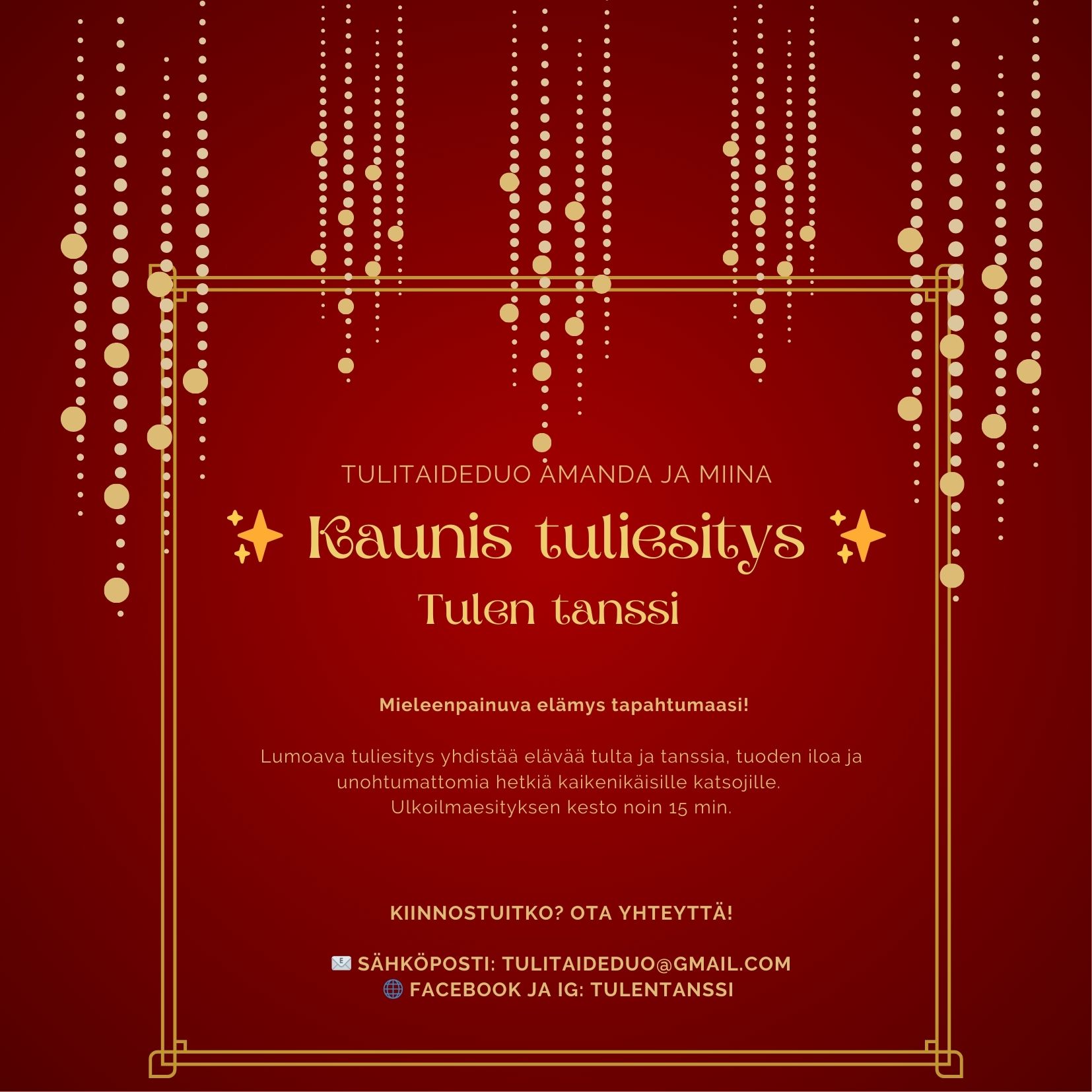 Tulishow OutoValossa, olipa upea . Mielettömiä itseä kutkuttelevia musavalintoja, kaunista liikettä ja taidokasta tuliesineiden käyttöä.